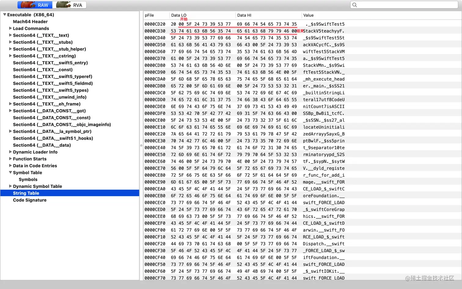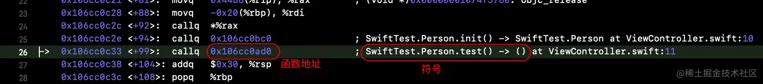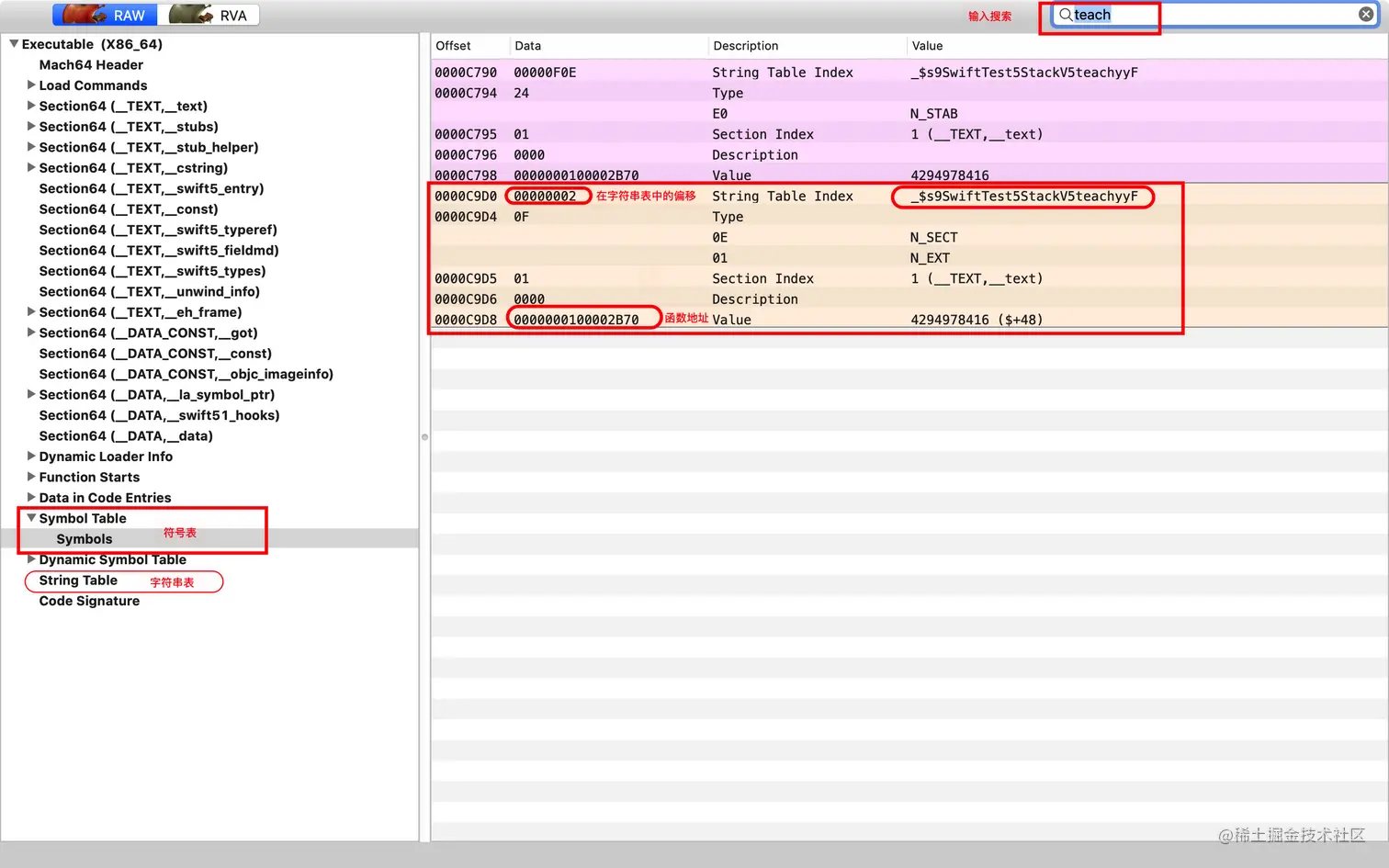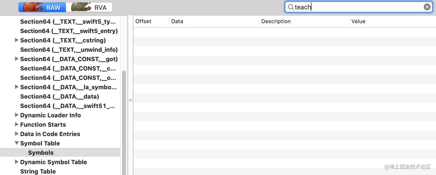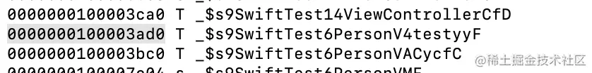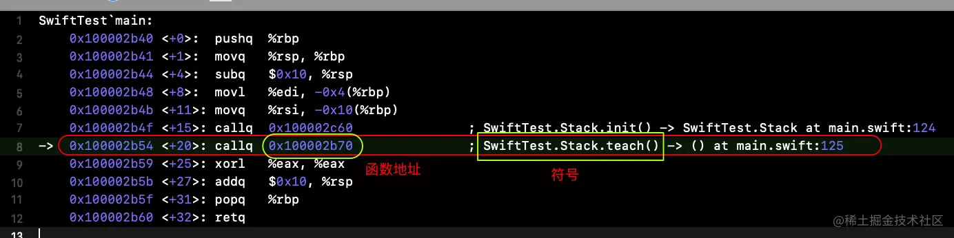 在上面的汇编图中有一个SwiftTest.Stack.teach()这个符号是从符号表中来