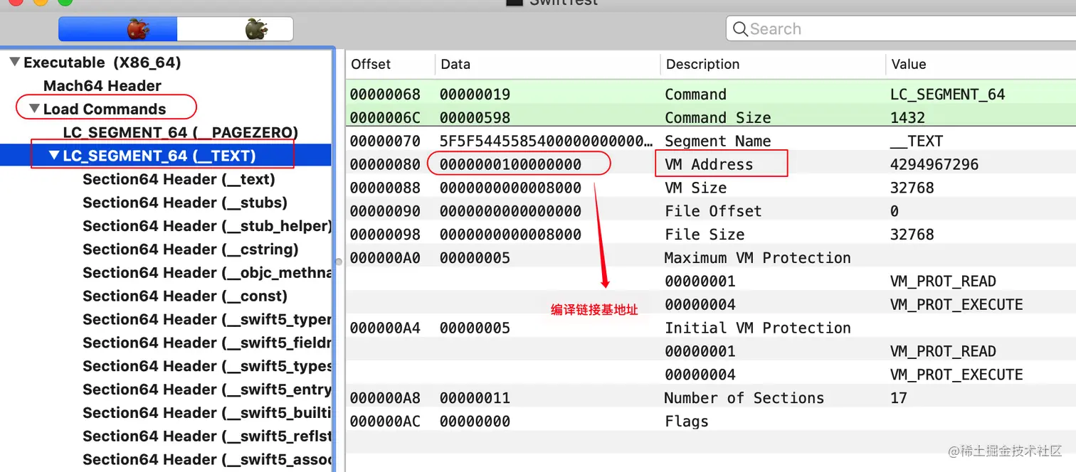 load Commands下的LC_SEGMENT_64(_TEST),找到VM Address,这个是编译链接基地址,