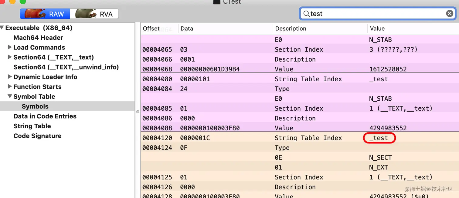 把可执行文件拖到machoview中查看symbol table