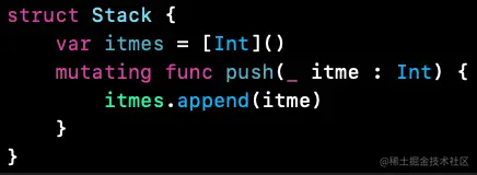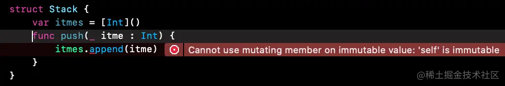 itme外还有一个参数self,这个self就是Stack,并且是let的类型的,let不允许修改,所以当我们修改itmes的时候修改的是stack本身,其实itmes是self.itmes的简写。