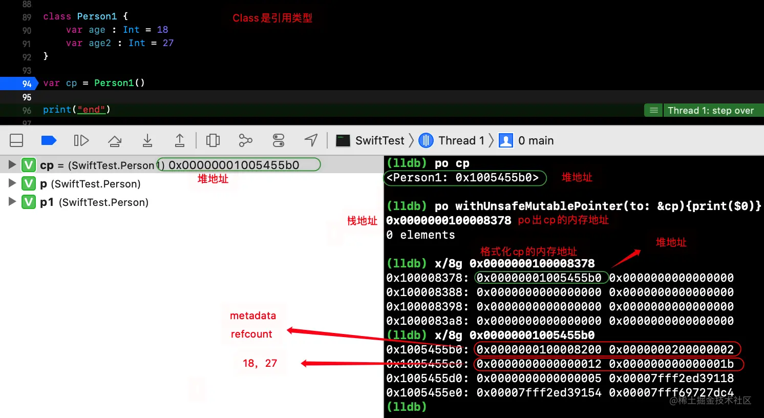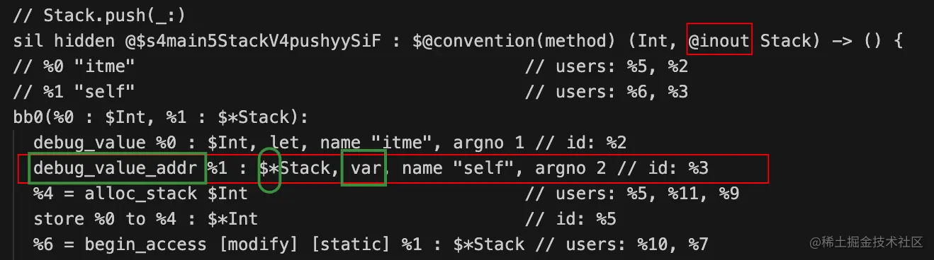 let变成了var,var可变,并且现在获取的是Stack的地址,不是之前直接获取的值了,所以mutating这个关键字是默认给他加了一个@inout关键字,mutating只在值类型里有用,在引用类型里没用,因为引用类型里修改的就是他的地址