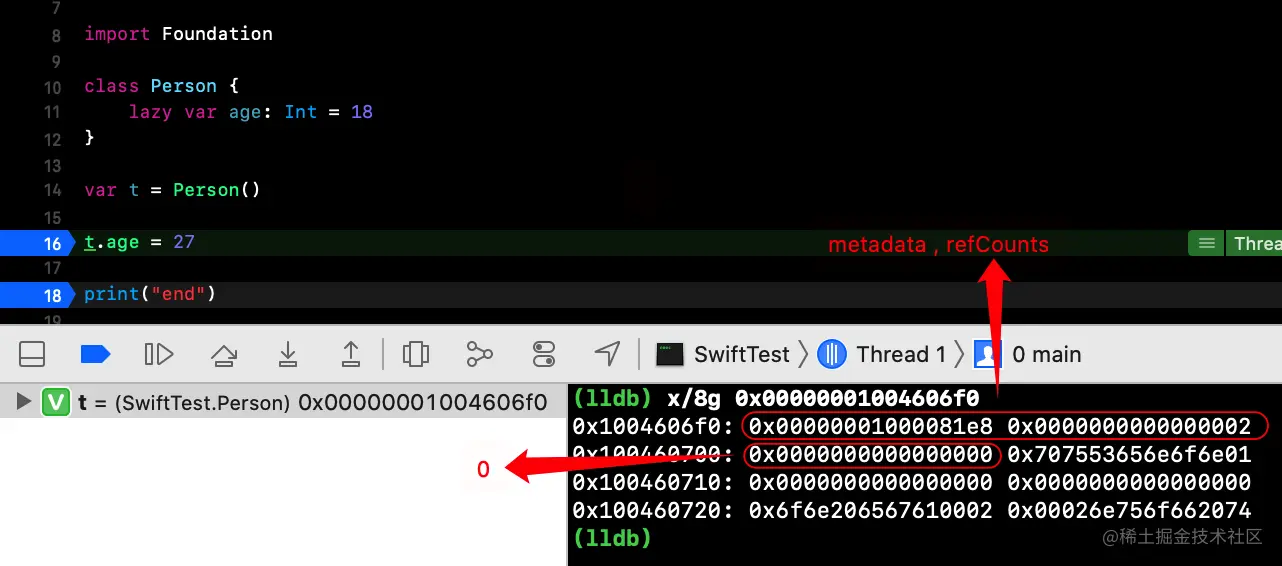lazy var age: Int = 18在底层是一个可选类型(默认是nil,内存0x0),在第一次访问他的时候访问的是getter方法,根据枚举值的分支,判断没有值,进入相应的分支来进行赋值的操作
