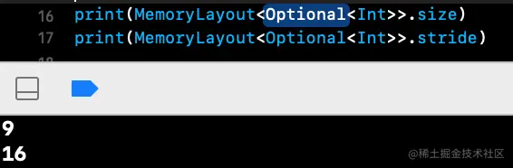 enum枚举,里面有none some两个枚举值,其中none没有值,占1个字节, some有值占8个字节所以Optional就占有9个字节,但根据字节对其的原则,必须要是8的倍数来进行字节对齐,所以就补齐到16字节;so经过前面的可得知