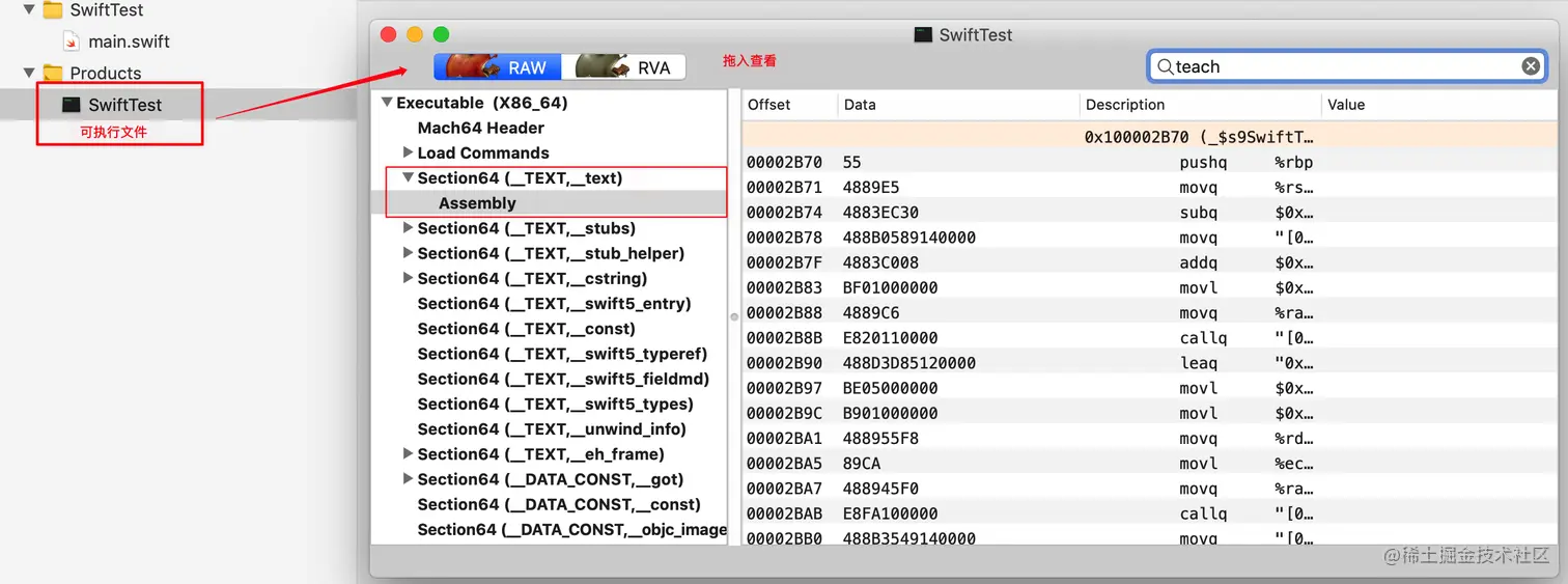 _TEXT,_text是代码段,代码段里包含了所有可执行的汇编指令,搜索teach在最上面一条出现0x100002b70这个函数地址和在汇编模式下看到的一样,在MachOView中可以直接看到函数的地址,因为在编译链接完成之后这个地址就已经确定了,所有的struct的函数调用都是静态调用