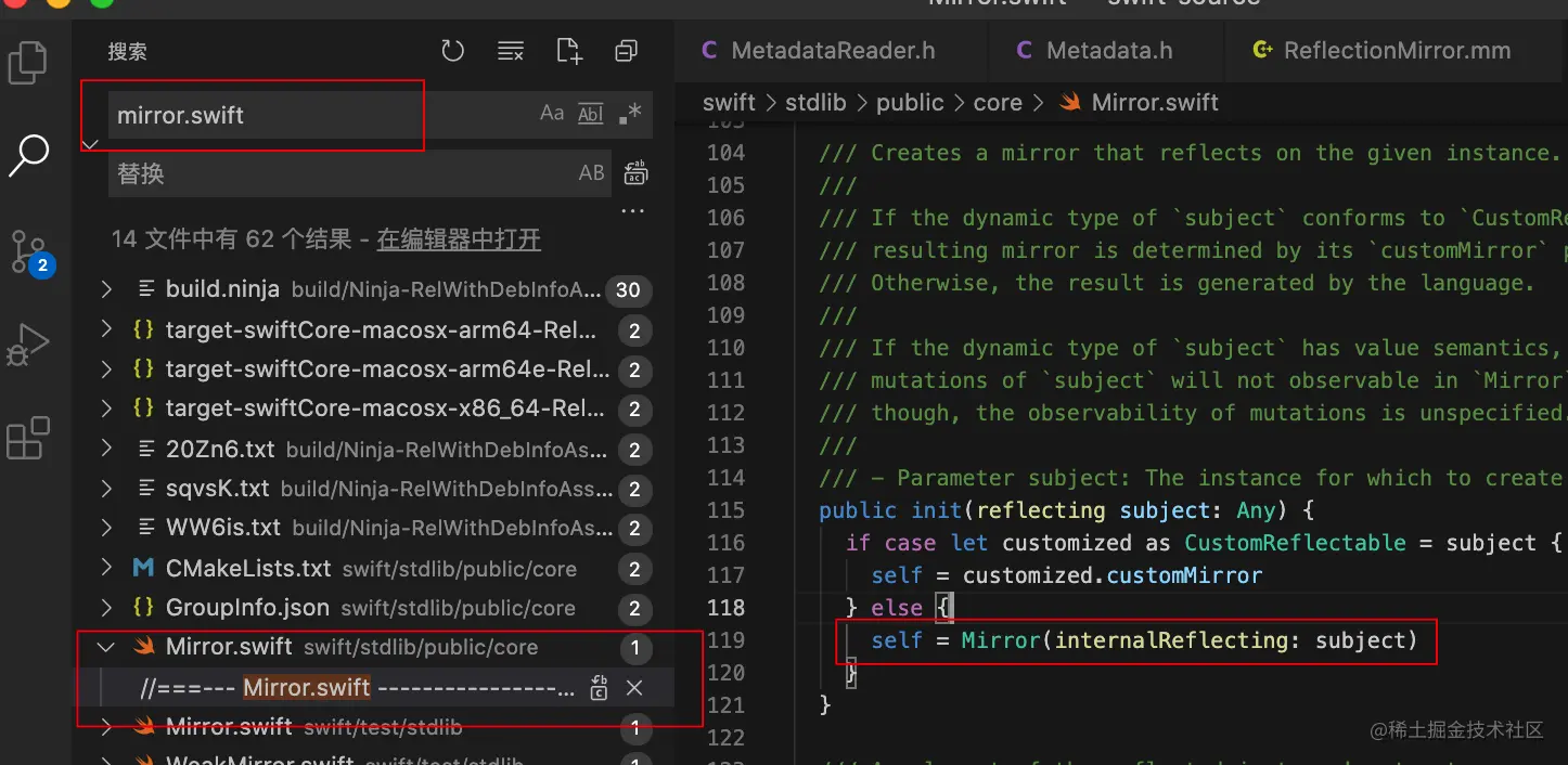 搜索mirror.swift在右边找到了初始化方法,又一个if语句,第一个是自定义的初始化,第二个是系统的初始化,主要看第二个