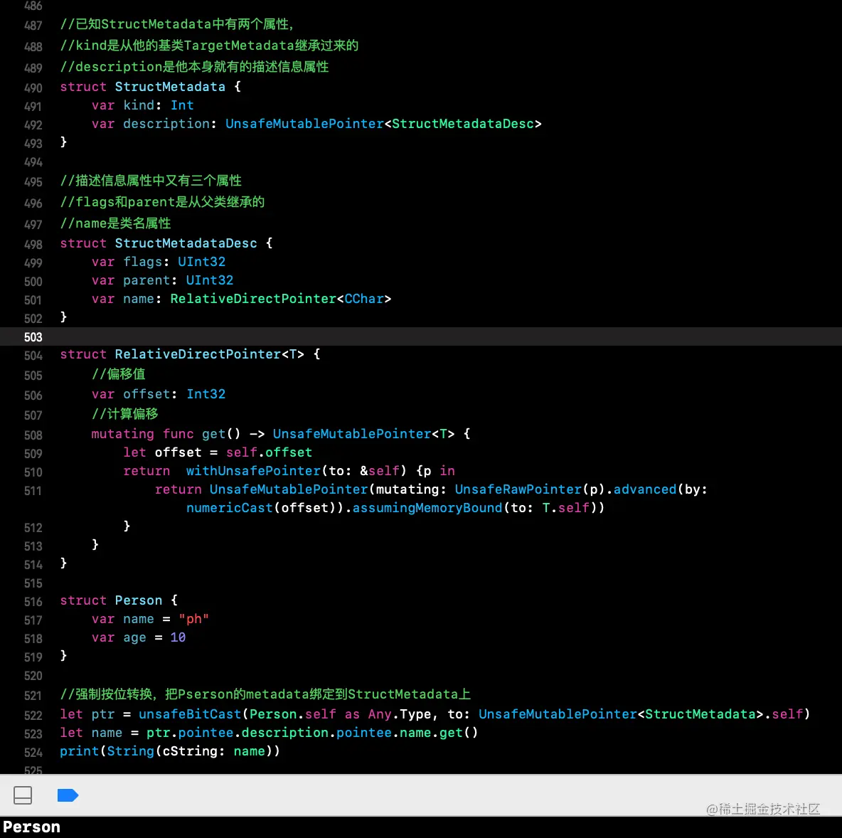 let ptr = unsafeBitCast(Person.self as Any.Type, to: UnsafeMutablePointer<StructMetadata>.self)