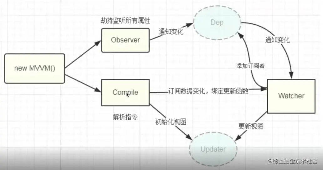 - 同时定义一个更新函数和Watcher, 将来对应数据变化时Watcher会调用更新函数