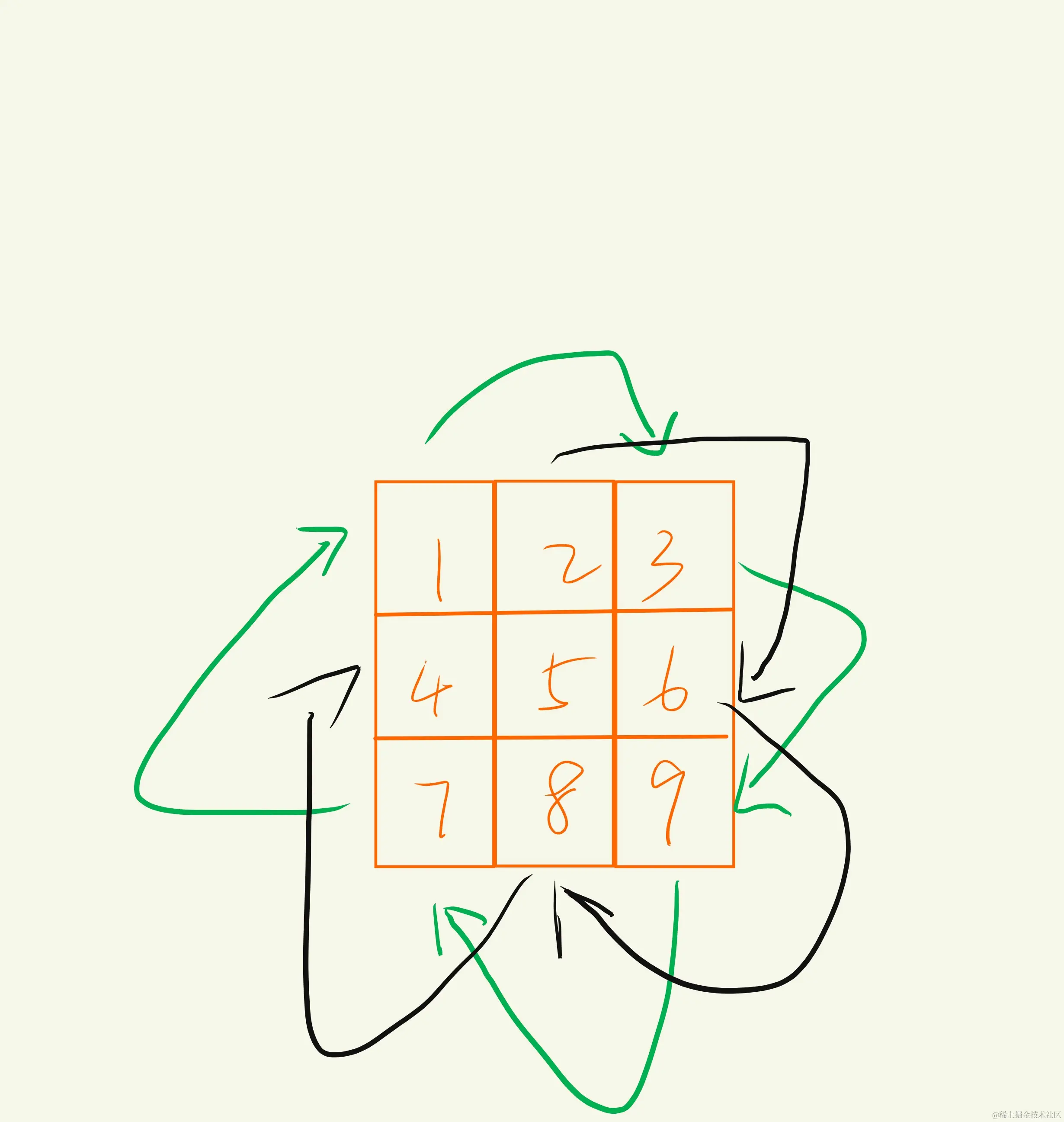 public void rotate(int[][] matrix) { int n = matrix.length; // 水平翻转 for (int i = 0; i < n / 2; ++i) { for (int j = 0; j < n; ++j) { int temp = matrix[i][j]; matrix[i][j] = matrix[n - i - 1][j]; matrix[n - i - 1][j] = temp; } } // 主对角线翻转 for (int i = 0; i < n; ++i) { for (int j = 0; j < i; ++j) { int temp = matrix[i][j]; matrix[i][j] = matrix[j][i]; matrix[j][i] = temp; } } }- 时间复杂度:O(N^2)