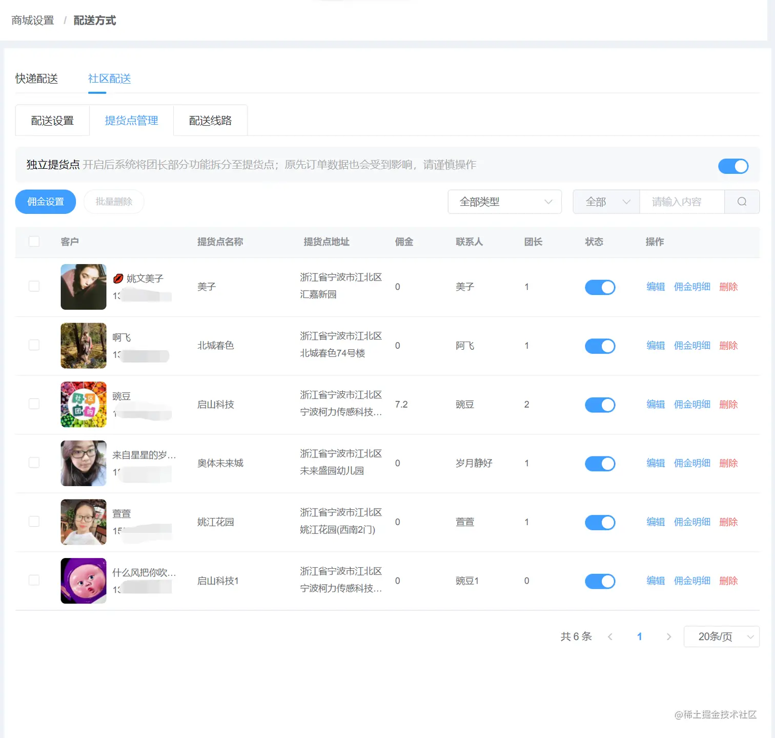 社区配送 : 定时自动生成发货单 独立提货点 佣金明细查看等等操作