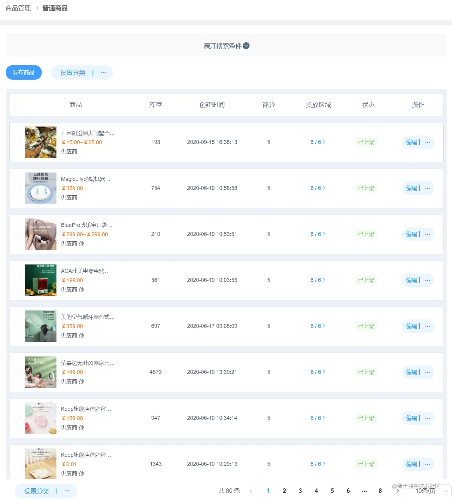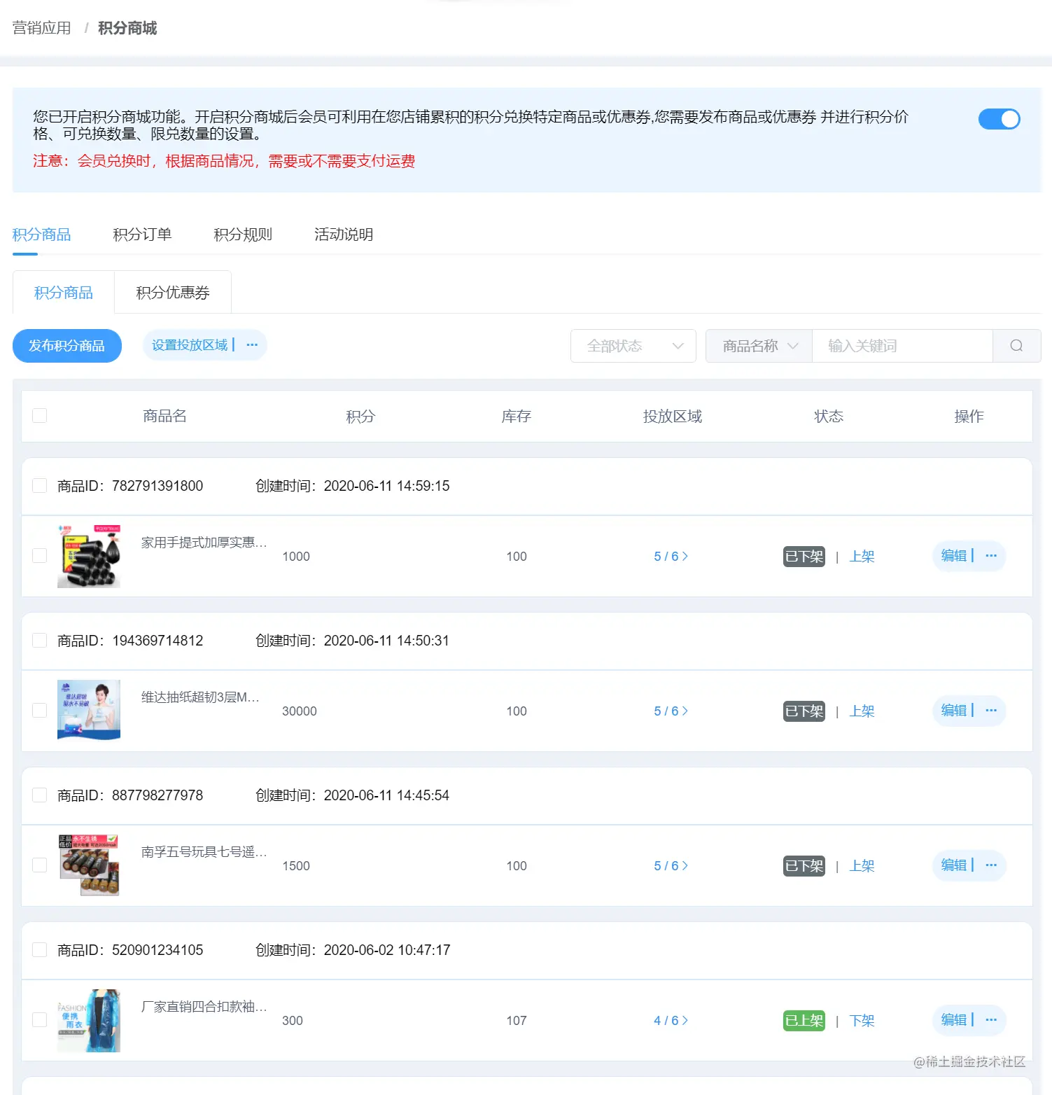 产品列表 : 设置商品投放区域,填充虚拟销量,多规格设置,快速转移专区,购买赠送积分等