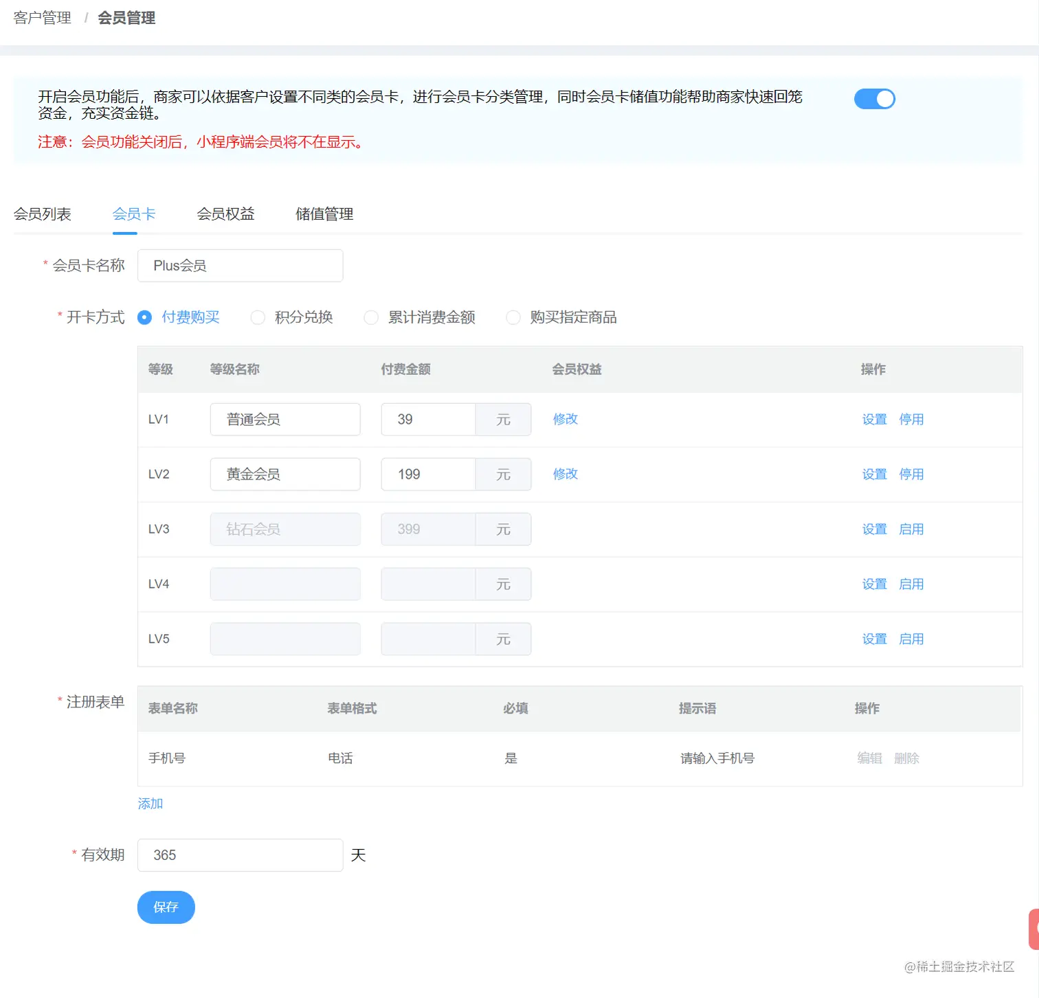 会员管理 : 统一管理会员用户信息 会员开卡形式(付费|积分|累计消费金额|购买指定商品等)