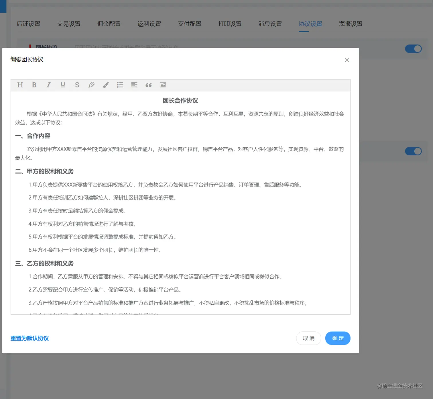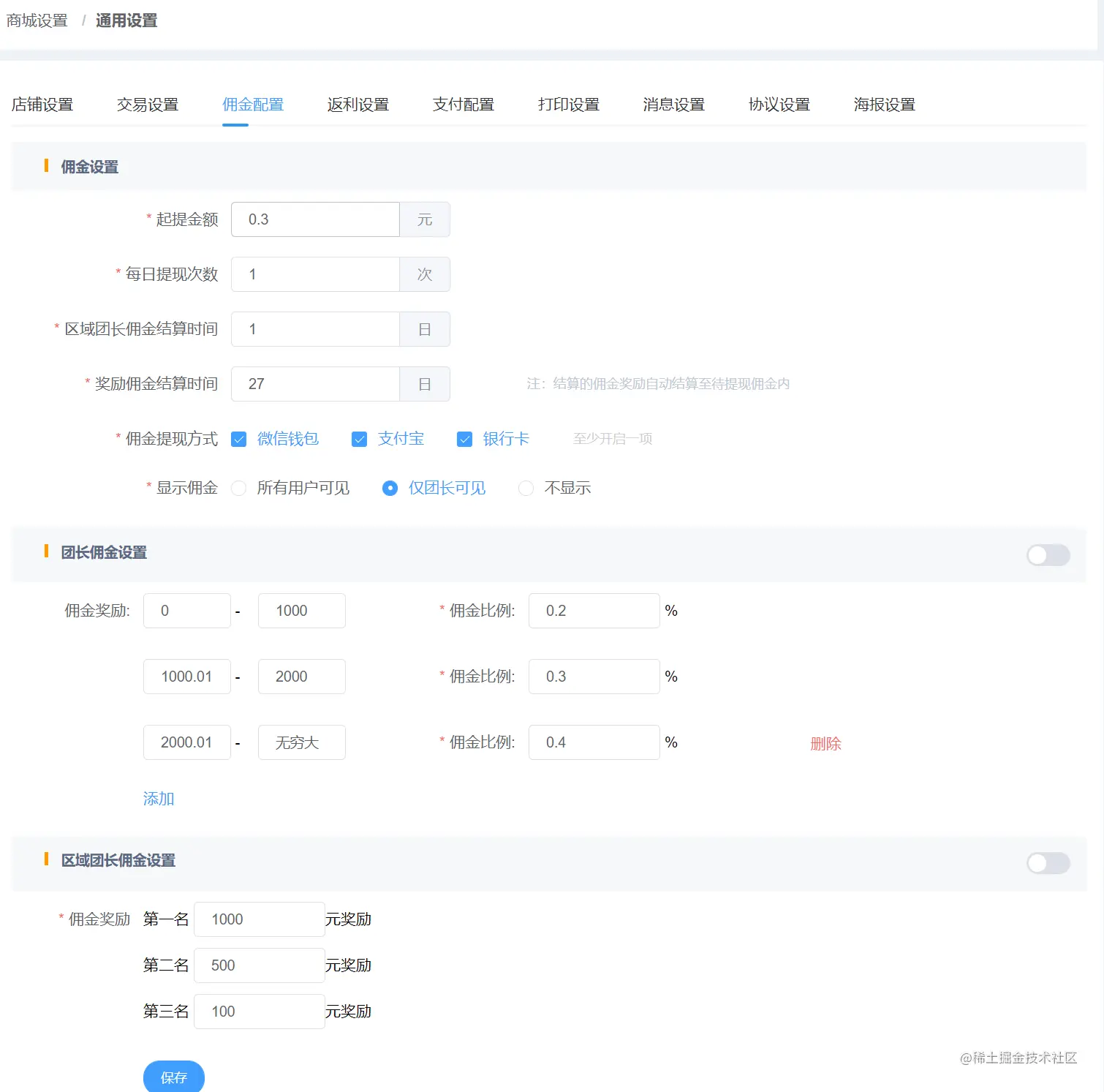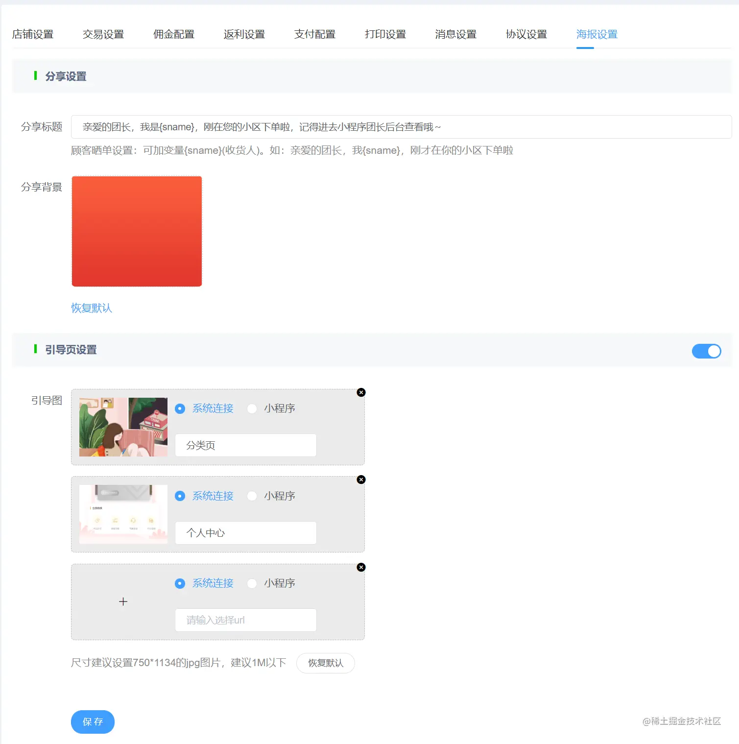 引导页 协议设置 交易设置 佣金配置