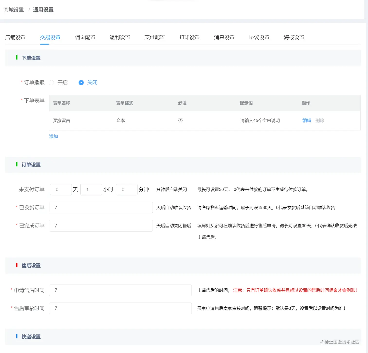 交易设置 : 设置订单交易规则(订单设置|售后设置) 用户下单语音播报提醒等