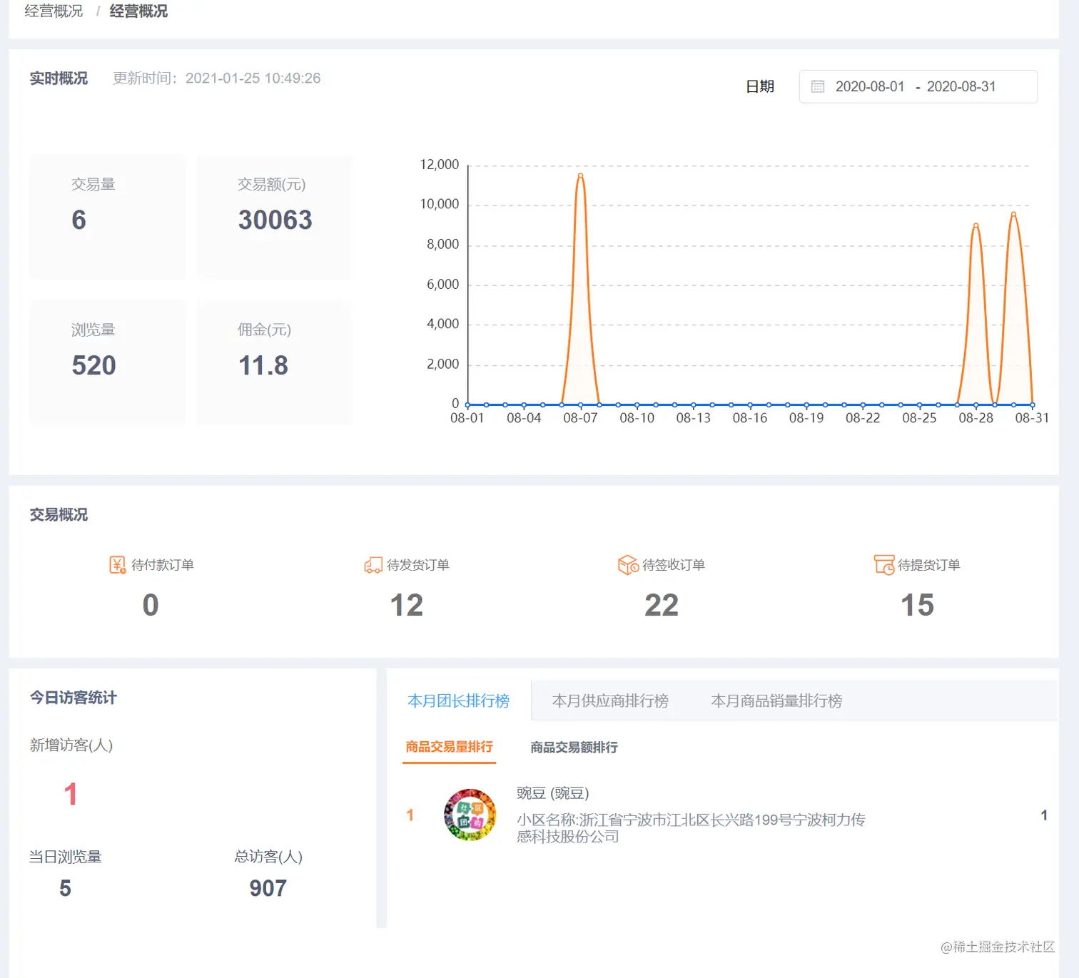排 行 榜 : 展示当月内团长,供应商,商品的排行信息(交易额 or 交易量)