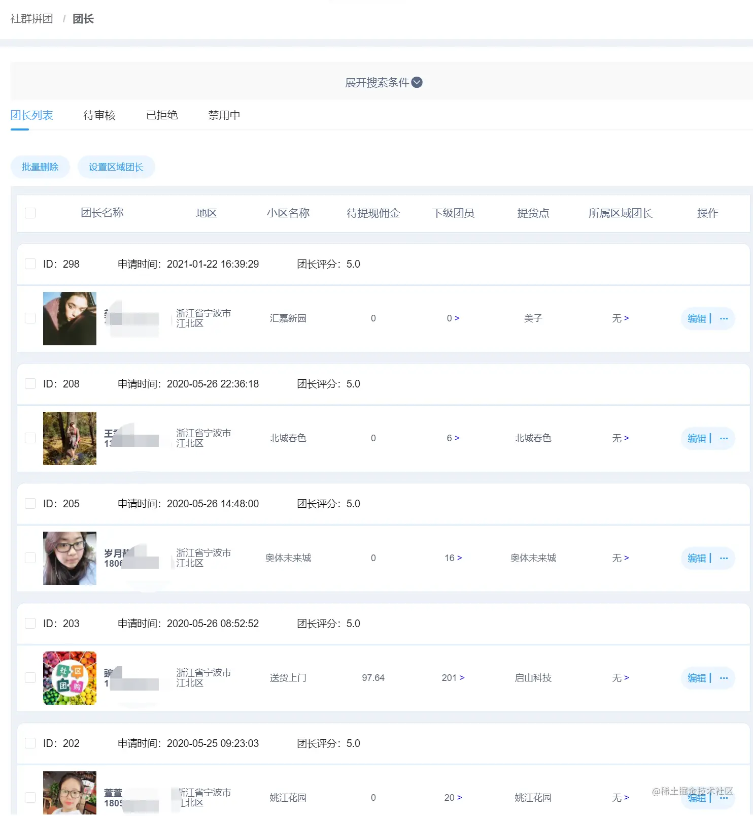 团长管理 : 统一管理所有团长,可以启用/停用团长资格,根据团长表现升级区域团长,也可编辑团长基本信息及删除等操作