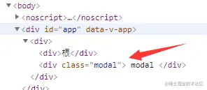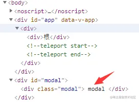 首先在 public/index.html 下面在 app 同级 添加一个 modal div, teleport 将要放到的地方