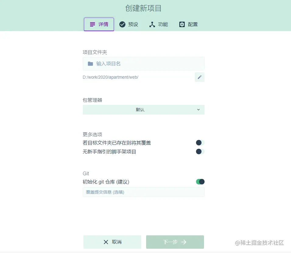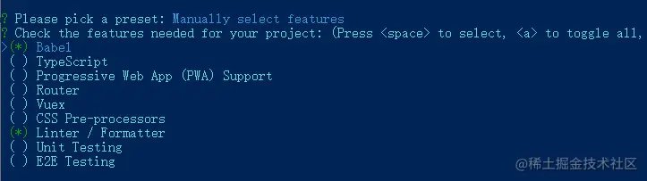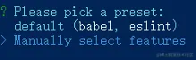 此处有一个选择,第一个 defalut 是默认的不包含 ts 编译支持的,需要选择 Manually select features 即手动选择添加 ts 支持
