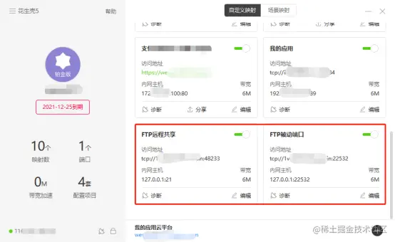 这里需要特别注意的是,FileZillaServer需要设置被动端口用于FTP数据传输,所以,还要用花生壳对FTP的被动端口进行映射,也就是一共需要2条映射。