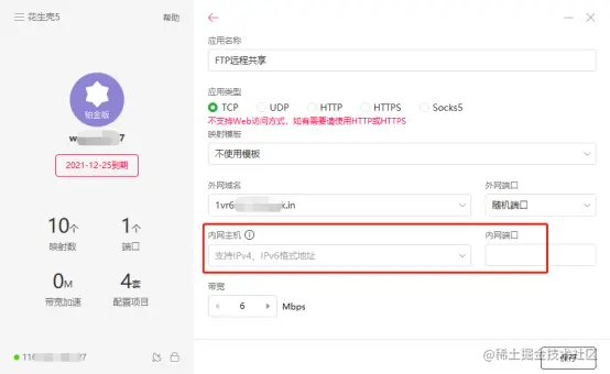 本地部署好FTP后只能满足局域网内访问,现在使用花生壳软件客户端进行端口映射。打开花生壳客户端,在“内网映射”界面正确填写部署FTP服务器的主机IP和FTP服务器的端口,填写完成点击保存就得到一个外网访问地址。