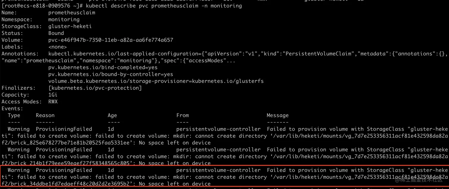 事情的经过是这样的,楼主在某一天使用k8s创建pvc的时候发现创建pvc无法自动创建pv和存储卷(楼主的架构是 heketi + glusterfs),随即查看了pvc的创建事件