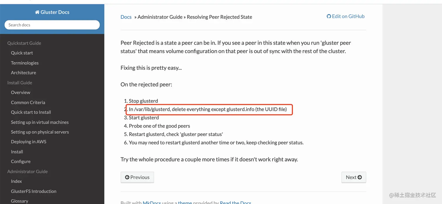 官方需要我们删除 /var/lib/glusterd 目录下除了glusterd.info 以外的所有文件