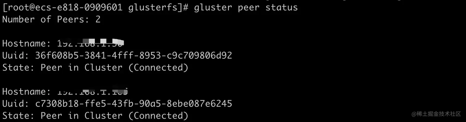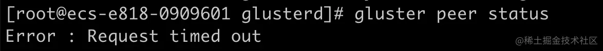 既然不是磁盘空间的问题,楼主进行下一步排错,分别去三台glusterfs节点上执行 gluster peer status 查看,发现其中一台节点上出现超时情况,其余两个节点正常