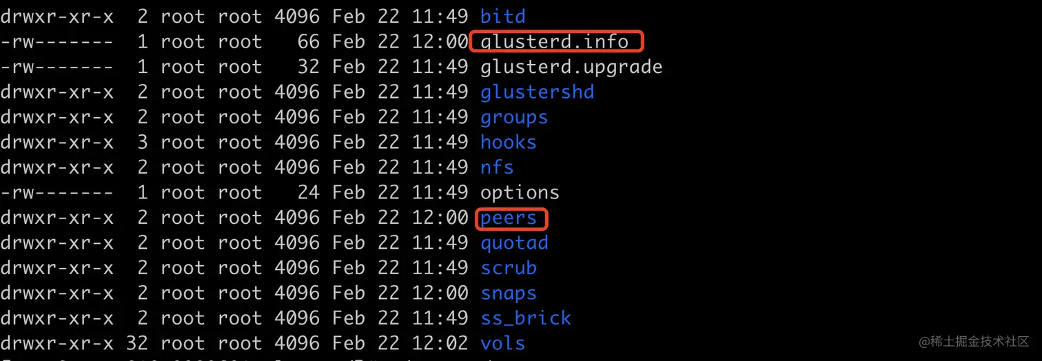 然后我尝试删除除了glusterd.info和peers目录以外的数据(只保留下图红框标记的文件)