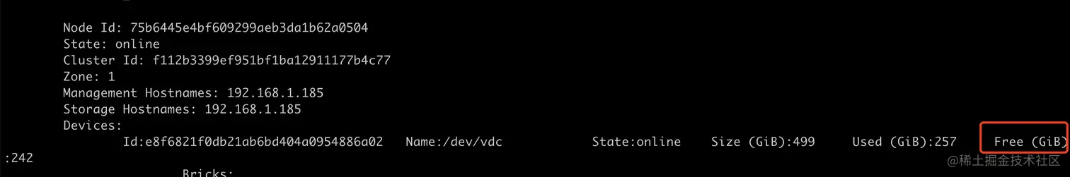 通过heketi-cli topology info 命令查看节点磁盘剩余空间是充足的(3台节点采用复制卷模式,磁盘大小都是500G,所以剩余空间都是一样的)