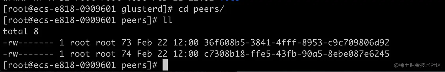 其中有一个叫peer的目录吸引了我的目光,进入peer目录发现,里边存储的是glusterfs生成的收信任节点的名称