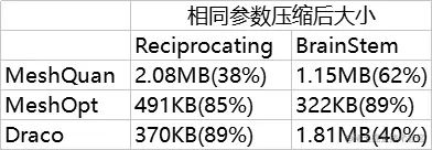 那么由于默认参数是不相同的,对比起来draco就有优势了,所以把其他需要相同压缩参数重新对比下,这次仅仅需要对比BrainStem和ReciprocatingSaw即可,这里把gltfpack参数向draco对齐