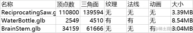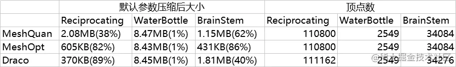这里可以看到仅仅有顶点数据ReciprocatingSaw.glb则是draco是最好的,其实原因也很简单,Draco默认压缩参数比meshQuan激进得多,但是有动画的BrainStem.glb meshOpt是最好的。WaterBottle.glb是都差不太多,因为顶点数量有限,纹理占据大量主要体积。