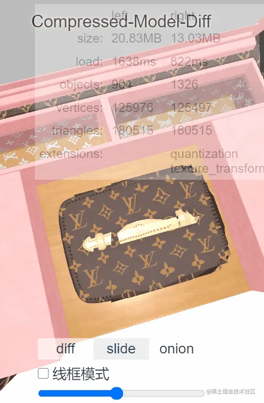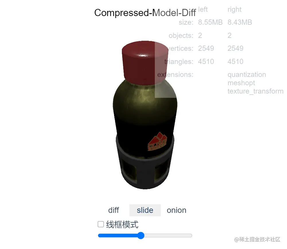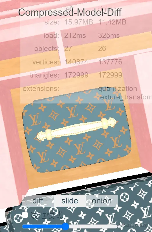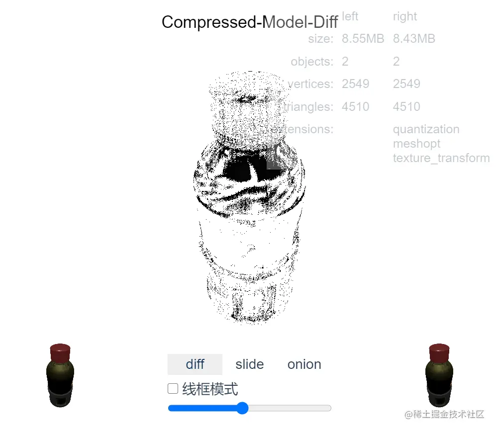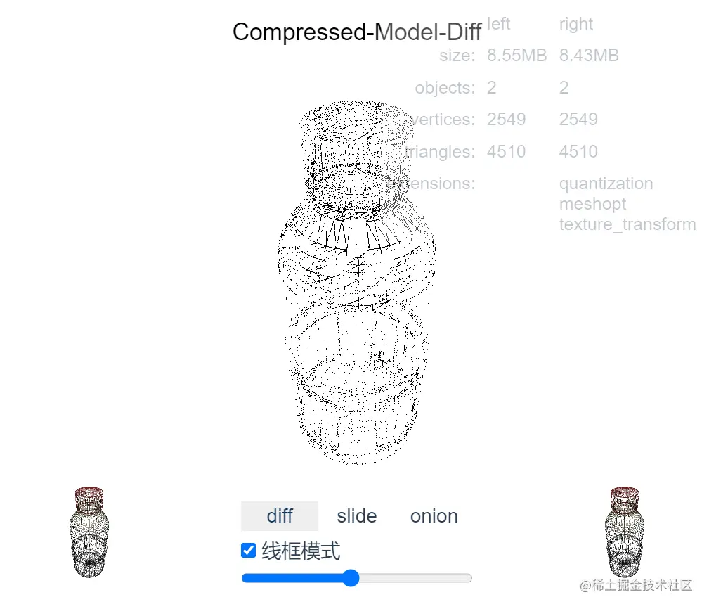 按道理除了对比性能上面的指标,还得对比压缩后是否出问题了,但是这个并不容易指标化,还是得看设计师是否妥协了,但是为了直观对比,所以我编写了一个compressed-model-diff工具