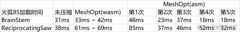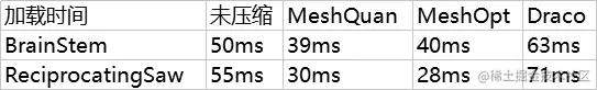 可以看到MeshQuan和MeshOpt均比未压缩加载时间减少了不少,Draco则增加不少,如果考虑decoder的加载时间则需要看首次加载,3个扩展里只有Darco会有影响,因为只有Draco是第一次加载gltf需要从网络下载wasm,MeshOpt是序列化好存在字符串里,使用时只需unpack即可,无需网络请求。