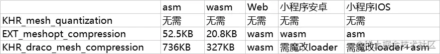 可以看到Draco在小程序上面就比较难受了,而MeshQuan无需decoder所以可用性是最高的,MeshOpt只需使用asm版兼容小程序ios即可。