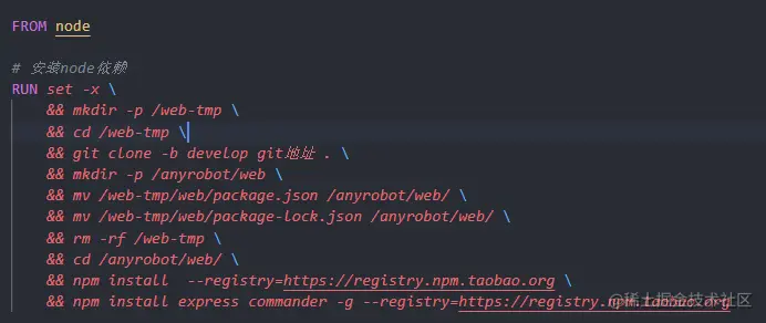 由于node_modulesz在项目中变化不会很频繁,所以将安装node_modules依赖包单独提出来构建,作为一个基础镜像,这样如果项目中的代码变化,依赖不变化,这个安装依赖的过程就不会执行,而是从何FROM命令引入基础镜像,将node_modules文件复制到react项目中,再进行代码构建,从而减少构建时间。