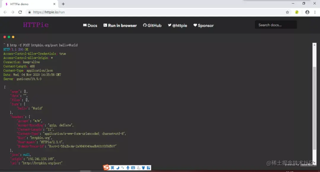 2、这行命令表示,向地址httpbin.org以表单的方式发送POST请求,-f选项表示表单格式提交数据。