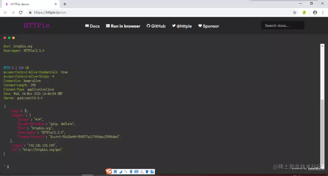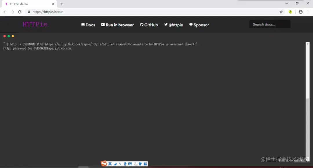 其他平台上的安装方法参考项目地址中的readme即可,写得很清晰。同时,HTTPie的官网还提供了一个工具,可以直接在浏览器上执行HTTPie命令,用来尝鲜、测试都很方便。