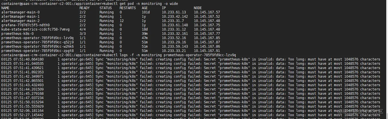 随即查看prometheus-operator的日志,提示secret数据太长