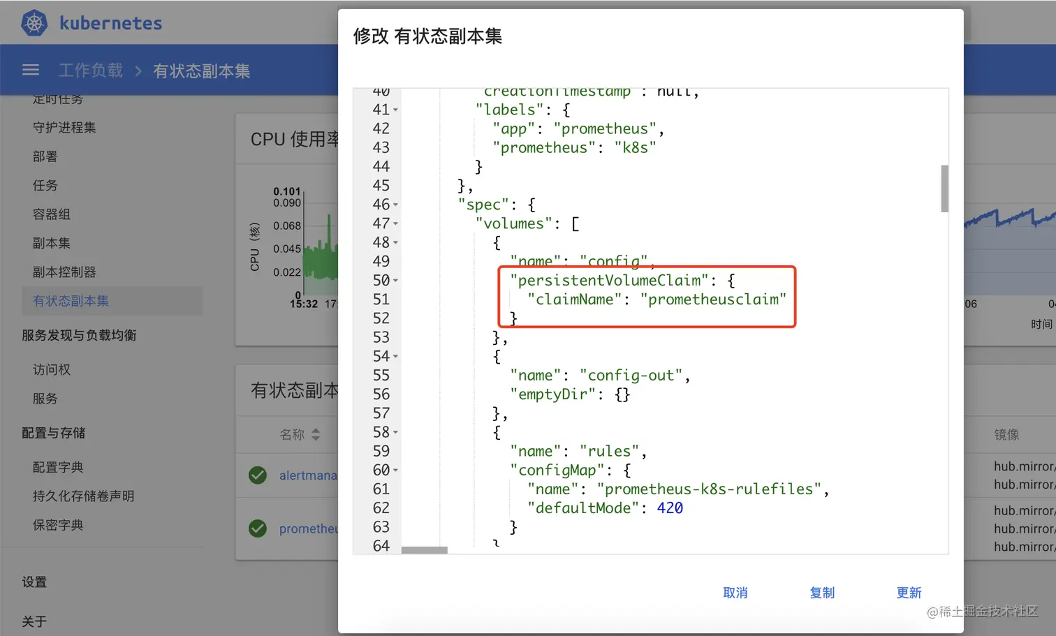 第二步:更改名为 prometheus-k8s 的 statefulsets