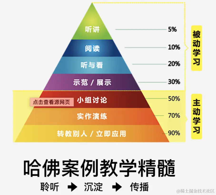 首先,我们大部分人的学习,通常是处于无意识的状态,觉得自己总是在不停的看新东西,但是实际上都是浅尝辄止,而费曼学习就是让你有意识的主动学习,学习吸收率的金字塔如下:发现自己平常的学习都是听与看加辅助一些实战演练,但是吸收率还是不够高的,因此,一方面是实战演练也是照着听讲来做的,所以最好的方式还是需要转教给他人,然后在这过程中查漏补缺。