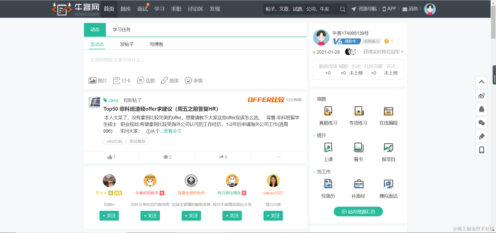 有了简历,可以找工作了,牛客网找工作的神器,牛客网上会有很多牛人内推你(前提实力够)。
