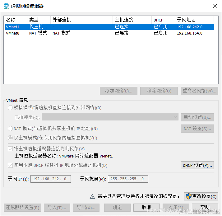 编辑->虚拟网络编辑器->右下角的更改设置->左下角的还原默认设置