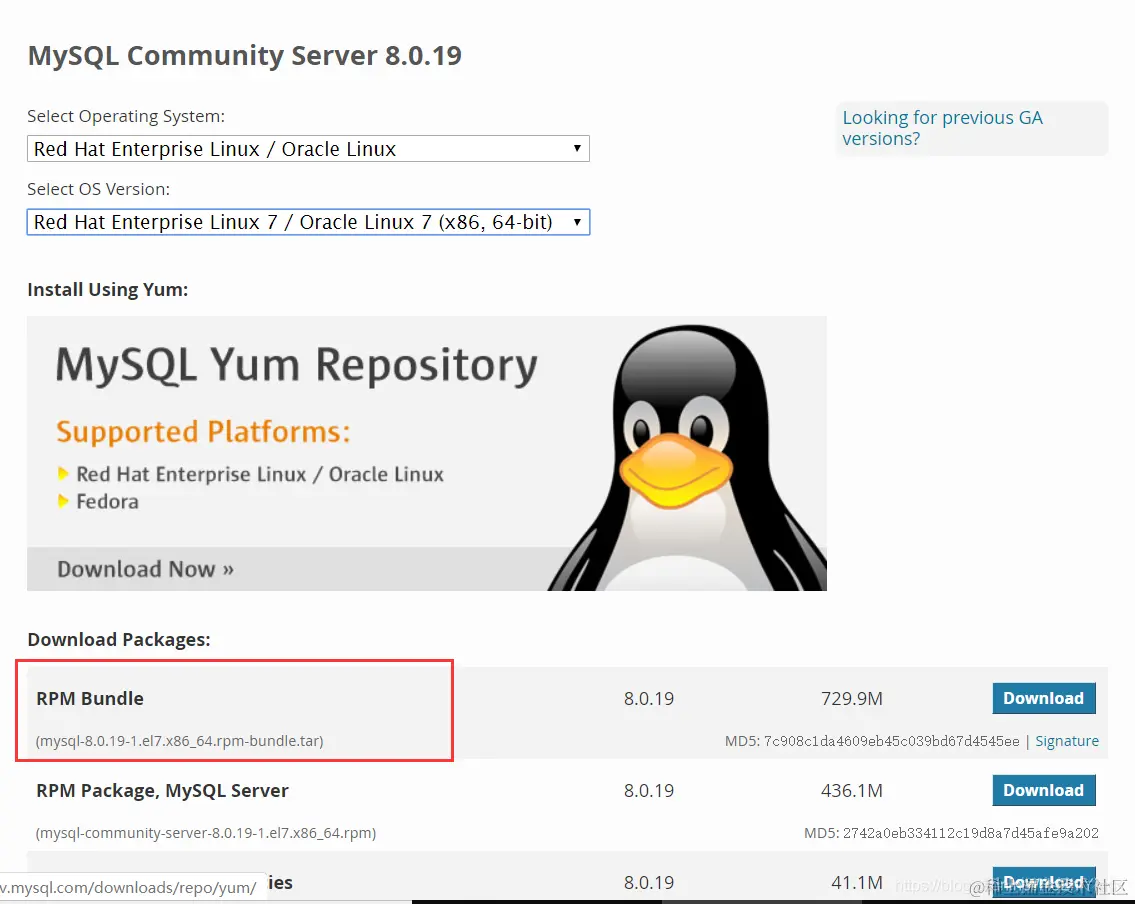 首先官网下载rpm包,这里我选择了bundle包,里面有各种MySQL的依赖