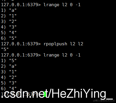 rpoplpush source destination,将第一个列表中最后一个元素移除,并添加到第二个列表中第一个位置