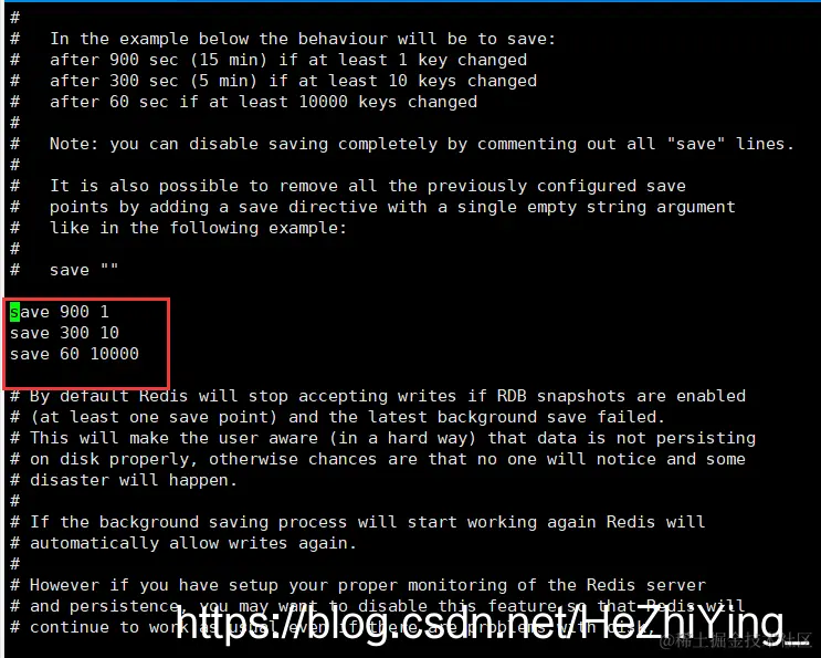 由于redis是对内存进行的操作,也就是并没有持久化,这里是对内存中数据进行持久化的操作,意思是,如果修改了1个数据,那么900秒后会进行一次持久化,如果修改了10个数据,那么会300秒后进行一次持久化,如果修改了10000个数据,那么在60秒后就会持久化一次,也就是说,你的修改越多,他持久化越频繁