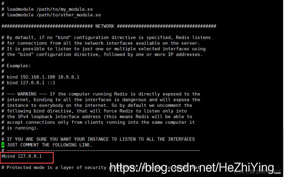 bind 127.0.0.1这个是绑定了我们的主机地址,意思是只允许我们主机访问redis,这句话注销掉,因为我们需要远程访问