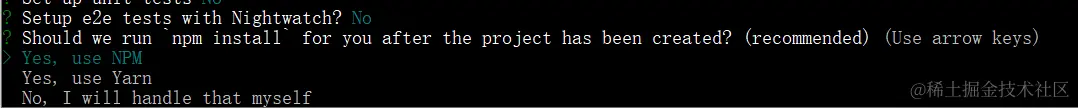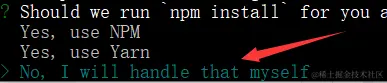 看到这个之后也选No,I will handle that myself,这个意思是问,我们是否需要运行npm install来安装依赖,我们选no,然后自己手动用cnpm install来安装依赖