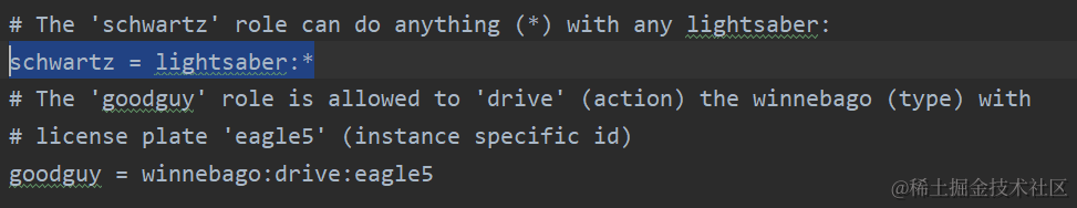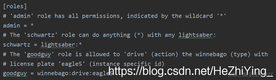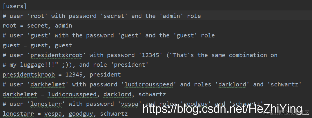 这里官方给出了一个[users]和一个[roles],其中users下的存放着不同身份的用户以及他们的密码和该用户下的角色