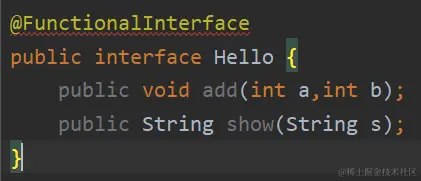 Lambda表达式想必大家都不陌生,jdk8的新特性,Lambda表达式需要函数式接口的支持,所谓函数式接口就是只有一个方法的接口,可以通过注解@FunctionalInterface来检查该接口是否是函数式接口,如下图左就是函数式接口,而右则不是。