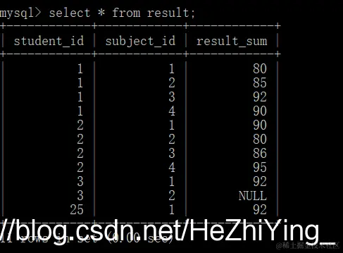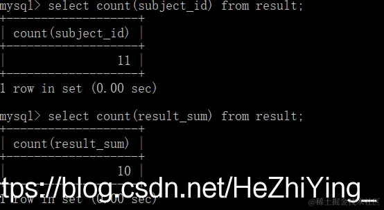 宅在家里写数据库中函数应用 已注销 2021-02-22 75 阅读1分钟 在数据库中,我们可以使用一些常用的内置函数来提升我们的工作效率,下面几个是在实际开发中用的比较多的 下面以一个result成绩表进行演示 count()计数,其语法是需要注明计数的字段,可以用*和1,下面进行演示字段计数,可以看出,没有统计null值 而count(*)和count(1)都会统计null值 sum(),求和 avg(),平均值 max(),最大值 min(),最小值